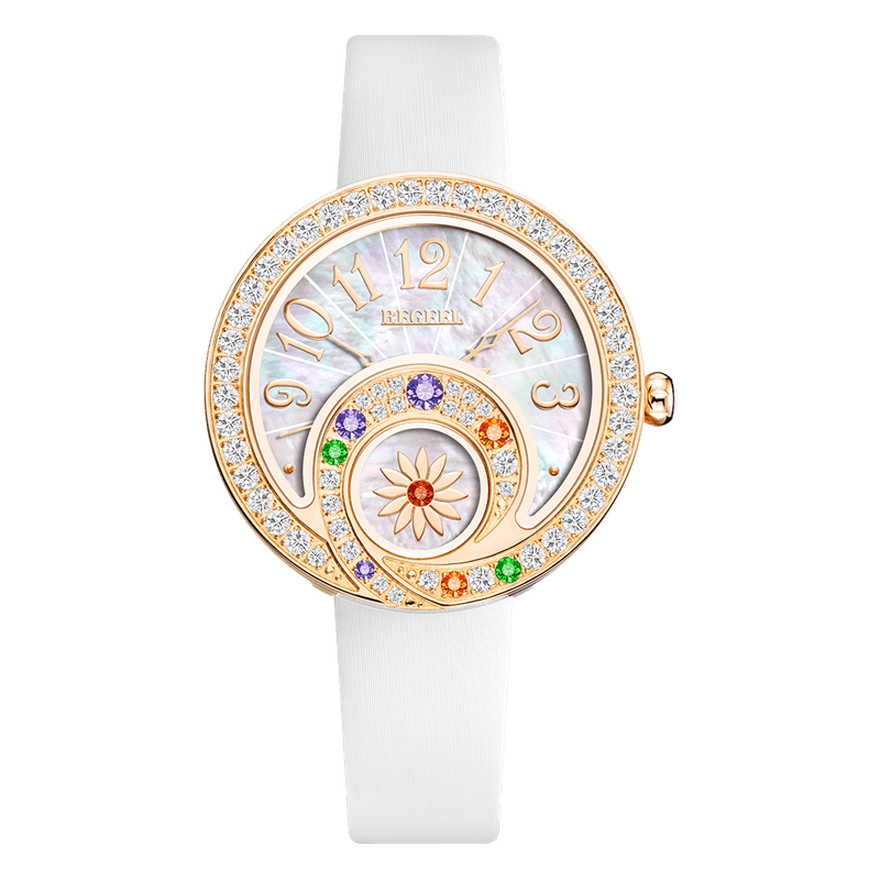 星座彩虹女神的名字來源于希臘神話中守護彩虹的女神IRIS。這款獨一無二的腕表表殼直徑為22.5毫米,白色珍珠殼表盤鑲嵌藍色、粉色和黃色寶石,并加入石榴石、紅寶石和祖母綠,打造彩虹色效果。表圈共鑲嵌30顆鉆石,表冠鑲嵌橢圓形鉆石,身份感高貴。星座系列的一個獨特設(shè)計是表帶與表體融為一體。拋光鍛造雙面表身和表帶的設(shè)計也繼承了星座系列的傳統(tǒng)特色。