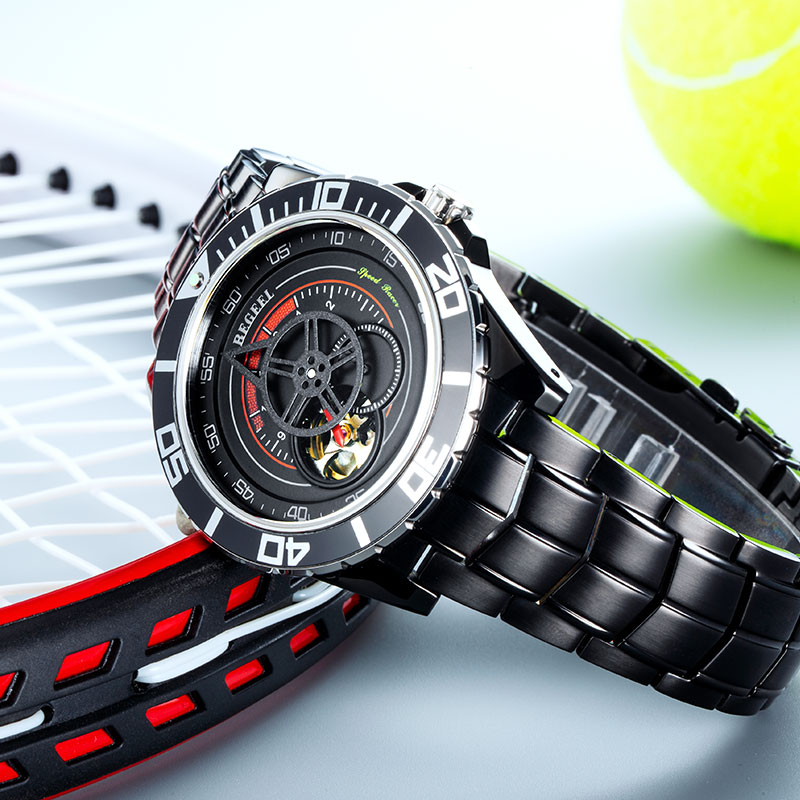 賓爵經典賽車系列又一力作,專為潮人設計。設計師將F1賽車的經典元素融入腕表設計,粗獷剛毅的線條,顛覆式時間顯示,融合現代撞色藝術,打造出這款時尚前衛的型男腕表。表盤跳脫出傳統的大三針,黑色三角齒輪式分針和60分鐘刻度圈以賽車輪輞和輪胎為靈感來源,4點位黑色小秒盤以賽車時速盤為原型,時針表盤設計源自賽車轉速盤,三層立體構造,指針形態各異,炫酷設計,彰顯時尚個性。