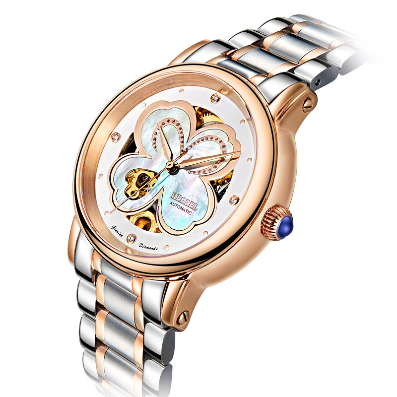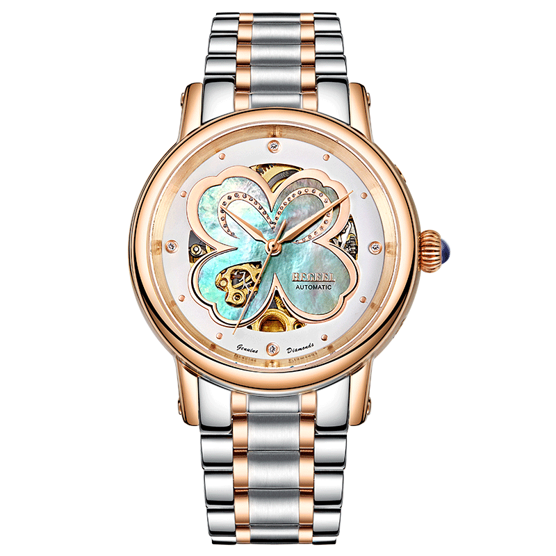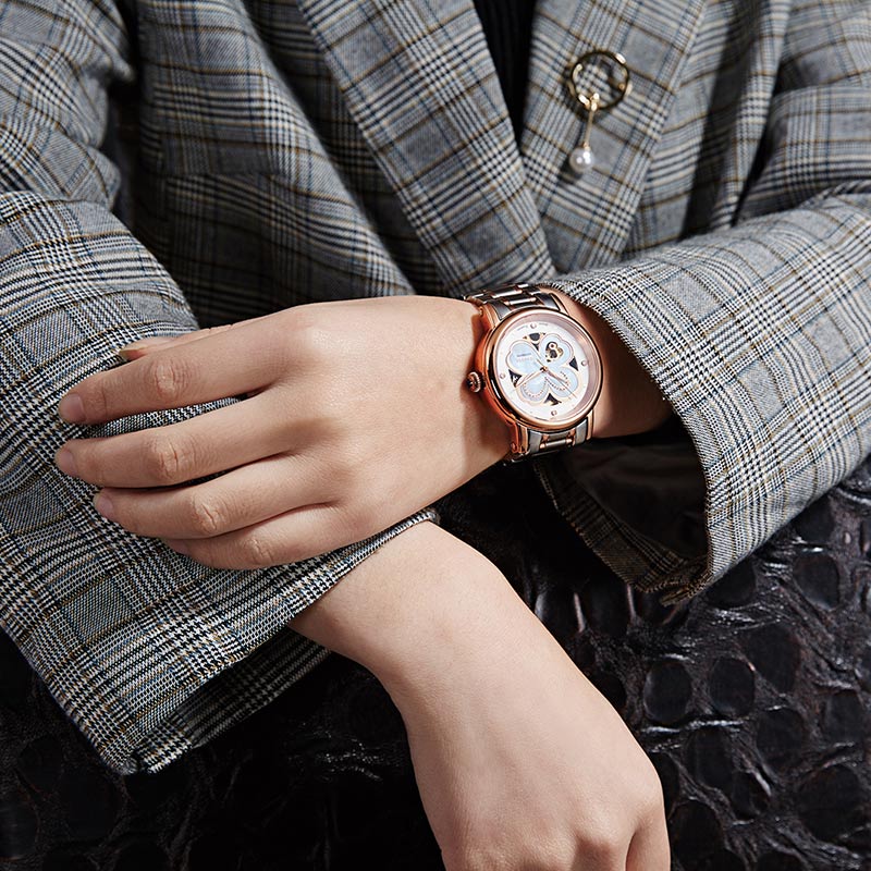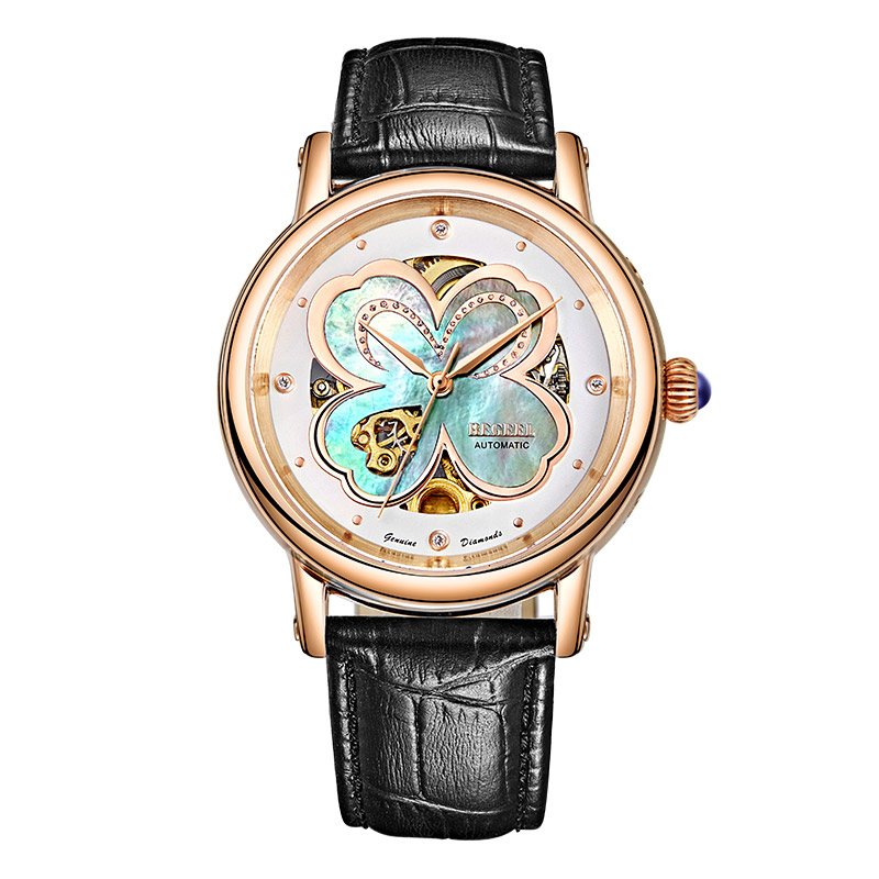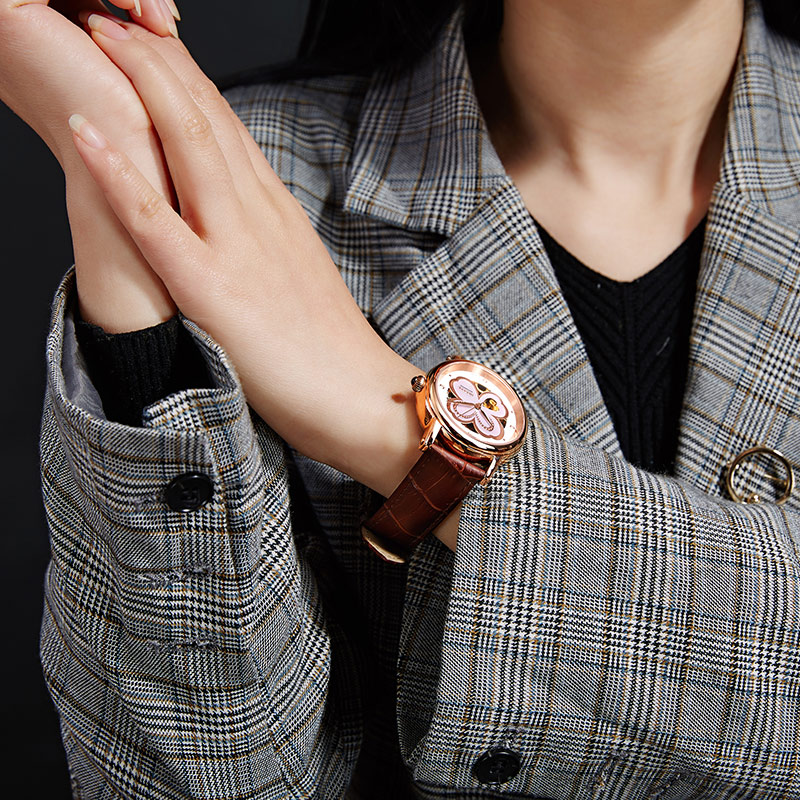 傳說中的四葉草(Clover)是夏娃從天國(guó)伊甸園帶到大地上的珍寶,花語(yǔ)是幸福。四葉草的四片葉瓣分別代表著:希望(hope)、信心(faith)、愛情(love)和幸運(yùn)(luck),找到了“四葉草”,也就擁有了幸福。賓爵設(shè)計(jì)師將這美麗的傳說鐫刻表盤,傳遞美與幸福。純凈珍珠母貝表盤采用了鏤空設(shè)計(jì),玫瑰金色靈動(dòng)曲線與晶鉆交匯勾勒出四葉草的葉瓣,設(shè)計(jì)師特別在第三片葉瓣中鏤雕出精美的心形,暗合其美好的愛情寓意,匠心巧思,可見一斑;隨著光線和角度的變幻,珍珠母貝呈現(xiàn)出不同的光影,金色機(jī)芯若隱若現(xiàn),炫彩動(dòng)人,美輪美奐。