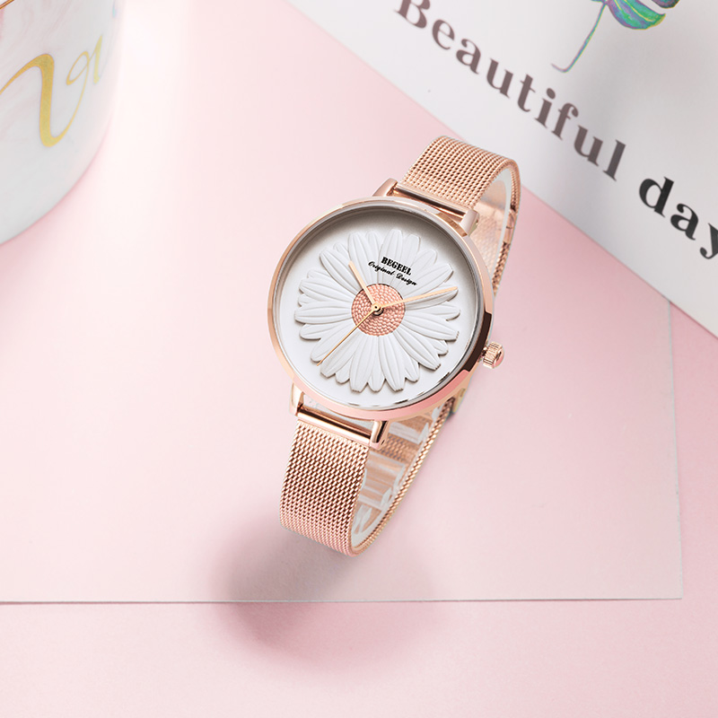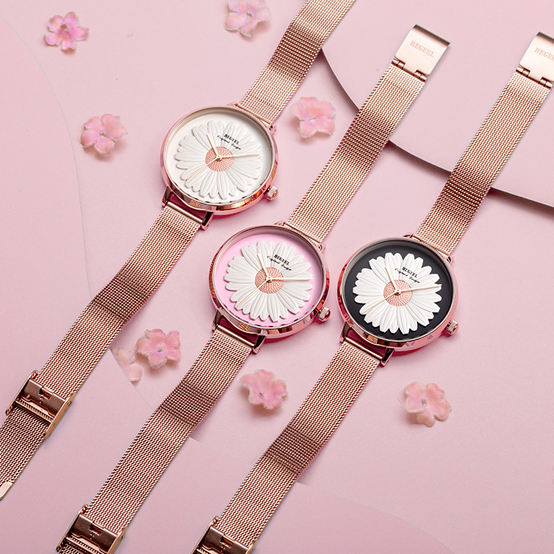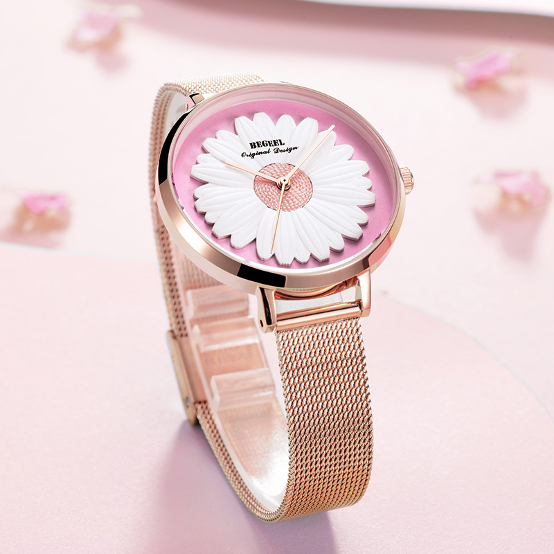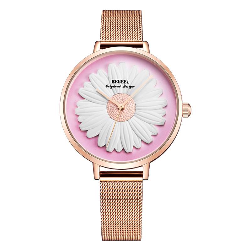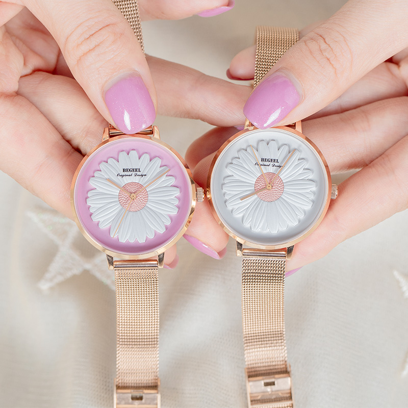 以大自然元素,設計出妙趣橫生的清新少女風腕表。白色的雛菊花瓣微微含露,立體而有質感,像少女的悸動含羞。清新浪漫雛菊立體表盤,素顏的配色的3D花朵宛如腕上花園,多一分俏皮。妙趣橫生的自然之美,讓人一見鐘情。淡雅的顏色和留白、粉色、黑色設計,展現出了田園風和淑女式的優雅。
