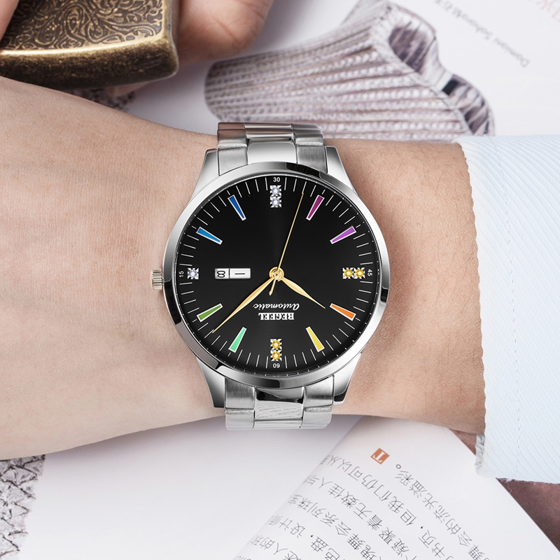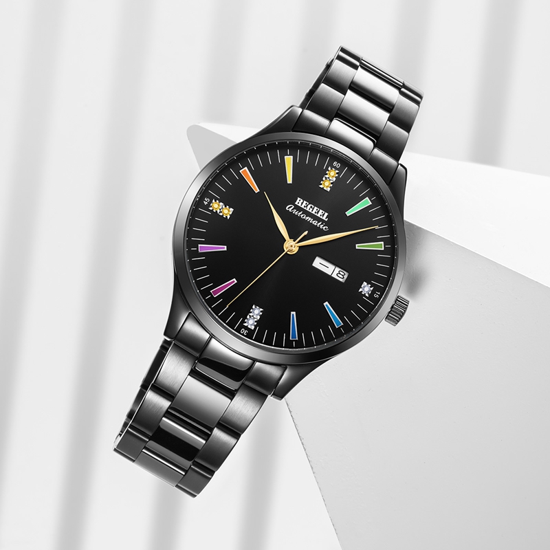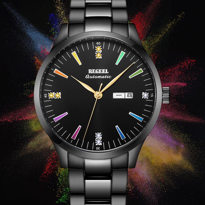 光透過三棱鏡的折射產生了繽紛光亮,宛若七色彩虹,設計師從中汲取靈感作為裝飾:彩色合成寶石與漸變條釘相互映襯,打造出如夢似幻的絢爛效果,頗具運動風的外型詮釋瀟灑型男的獨特選擇,時髦商務兩不誤。