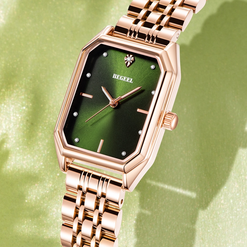 不似嫩綠的嬌俏,墨綠的深沉,代表著和平與希望的橄欖綠優雅獨樹一幟,有著歲月沉淀的內斂,光陰洗禮的含蓄。設計師從古希臘橄欖枝的色彩中汲取靈感,融入太陽紋細膩紋理使表盤產生幻變色彩,營造出溫婉柔美之感,仿佛可以凈化人的心靈,感受到和平與安寧。