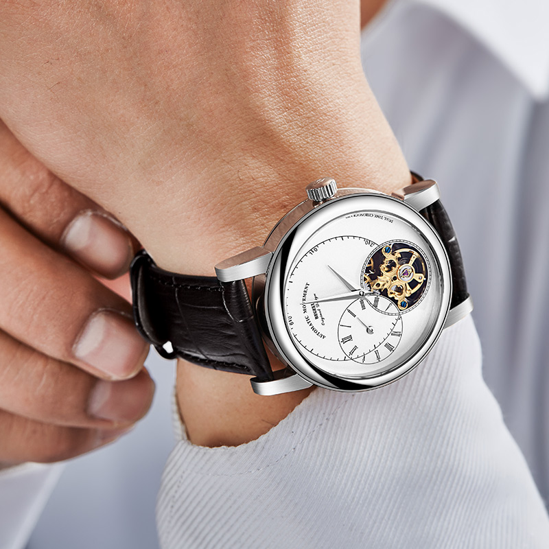 偏心式表盤(pán),素白表盤(pán)突破常規(guī),著眼于凸顯品牌原創(chuàng)特色,12點(diǎn)位分針大表盤(pán),9點(diǎn)位羅馬刻度小表盤(pán)和6點(diǎn)位鏤空飛輪視窗,三個(gè)不同的圓形相處包含,將現(xiàn)代幾何構(gòu)圖與偏心式設(shè)計(jì)融合,兼具功能性的同時(shí)不失簡(jiǎn)約感。6點(diǎn)位開(kāi)窗設(shè)計(jì),可清晰地欣賞機(jī)芯游絲的飛速運(yùn)轉(zhuǎn),將機(jī)芯的精華部分盡收眼底,正面感受機(jī)械運(yùn)轉(zhuǎn)的力量感。