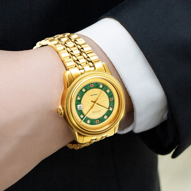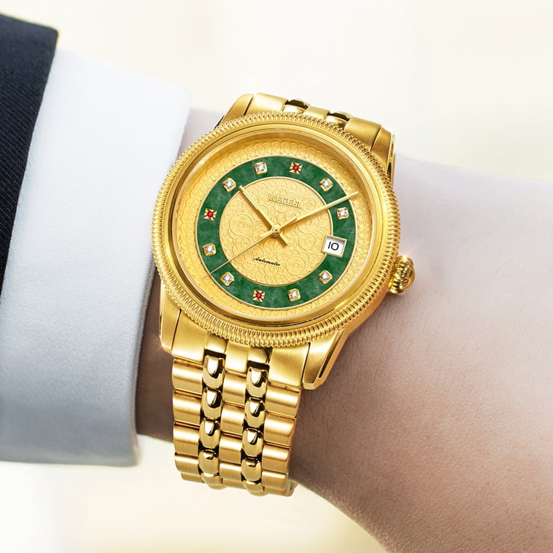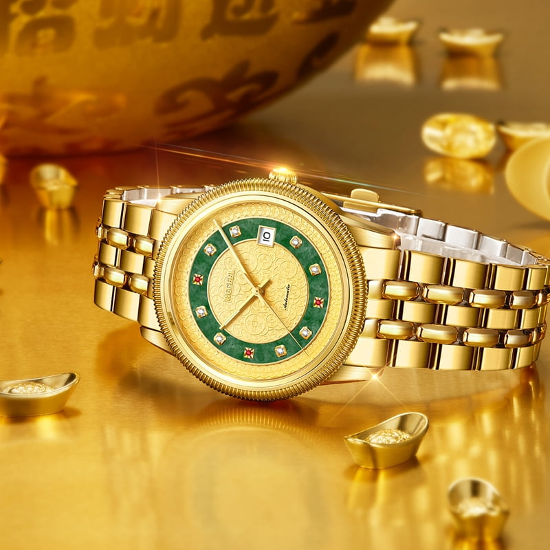 字面:金幣紋+貝殼翡翠紋,鑲8顆真鉆,3顆真紅寶石,指針:超強夜光