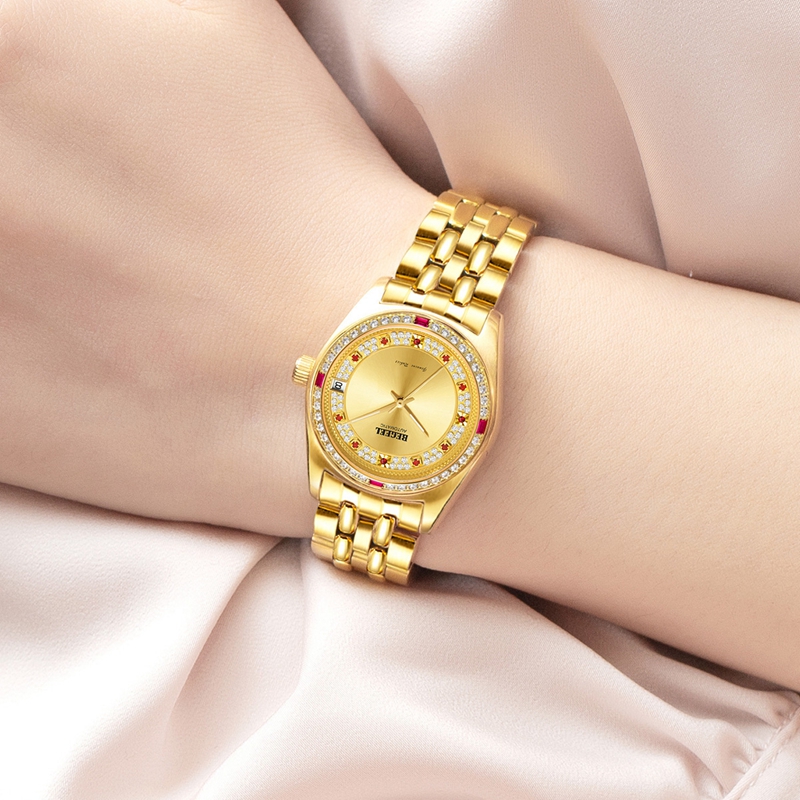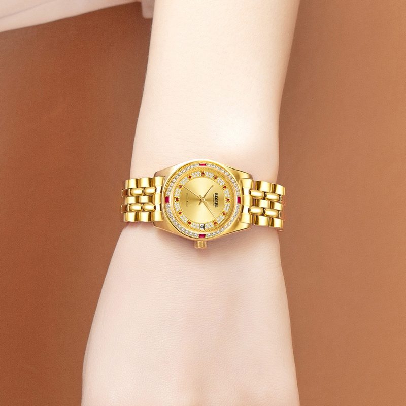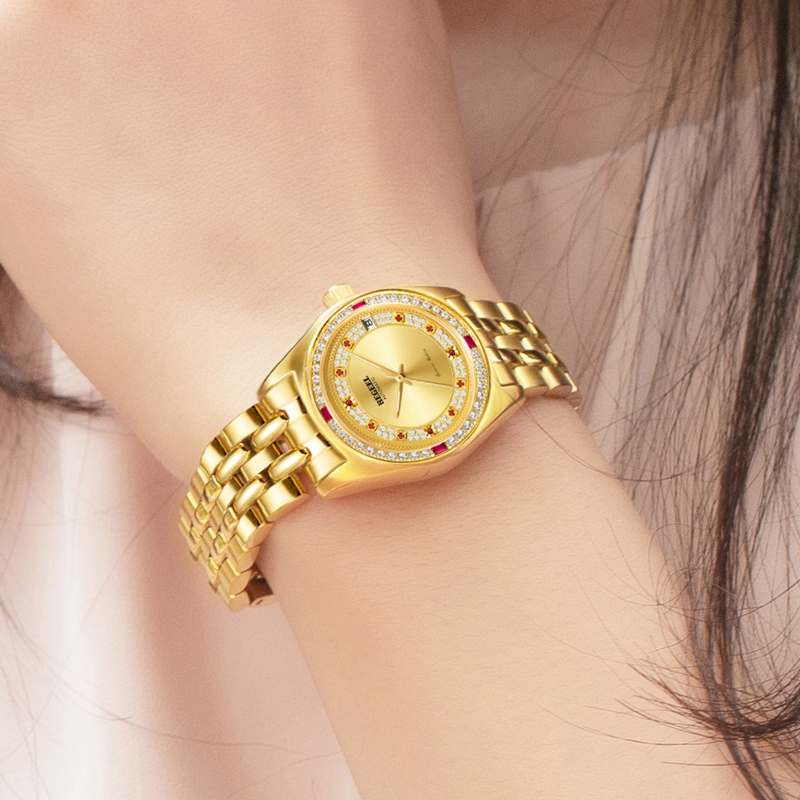 GOLDEN·流金系列-朝暮—愛不在一時,在朝朝暮暮。腕表采用了電鍍真金工藝,以紅寶石、水晶鉆環繞,如同一對互相吸引的戀人,總會重復愛上對方,再次為對方著迷。