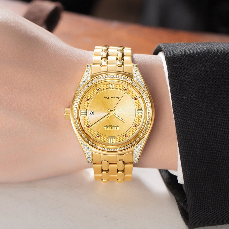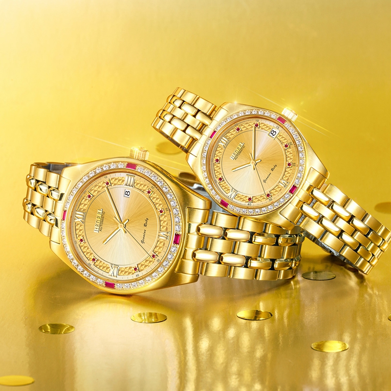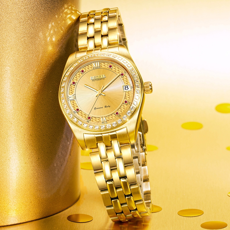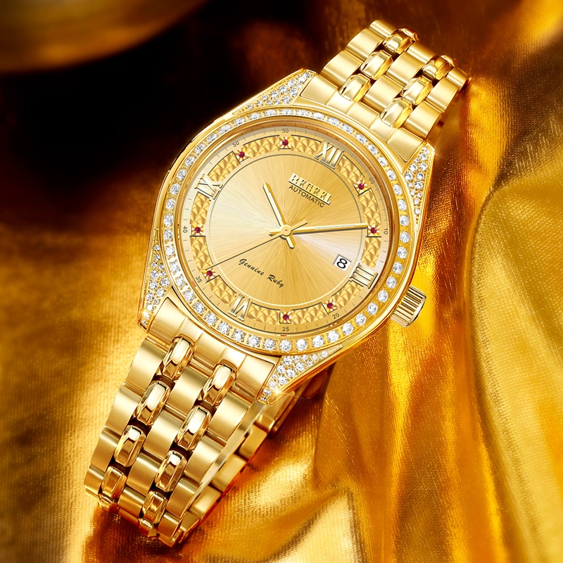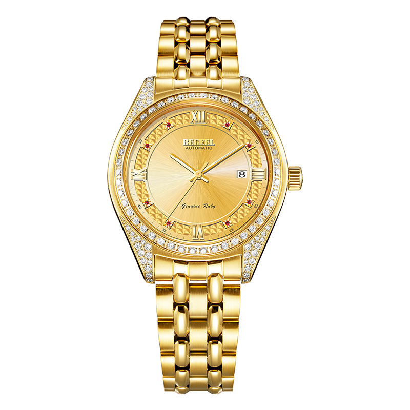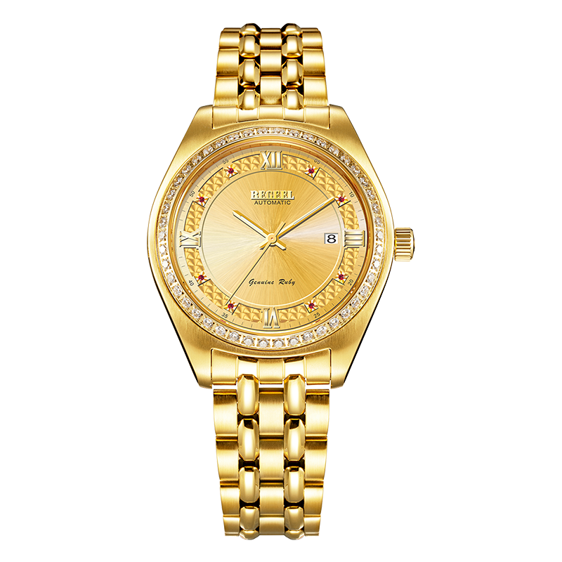 字面:鑲8顆真紅寶石,太陽紋+魚鱗紋,真釘logo,3 6 9 12為真釘刻度