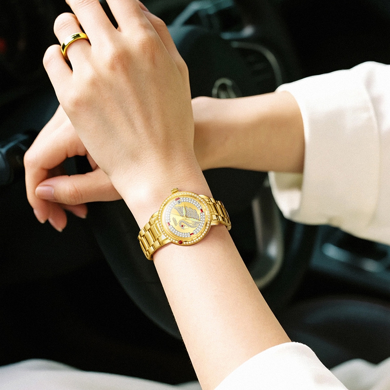 表殼:316L精鋼電鍍金,鑲57顆晶鉆,1顆Big合成紅寶石