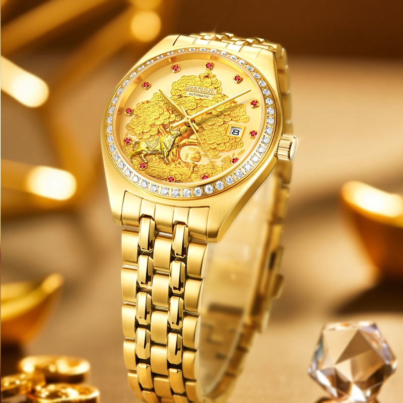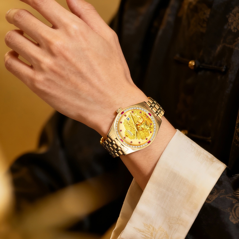 字面:雕刻金錢樹,浮雕金牛(鍍真金),鑲1顆真紅寶石(12時),磨砂金面,11顆合成紅寶石,夜光指針