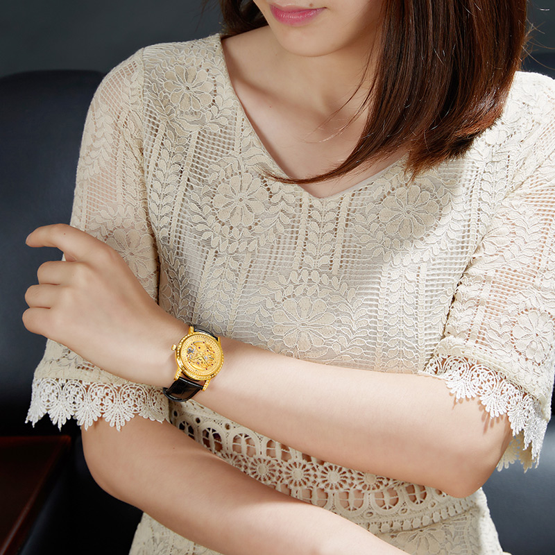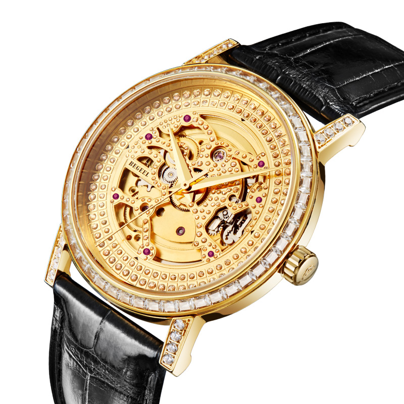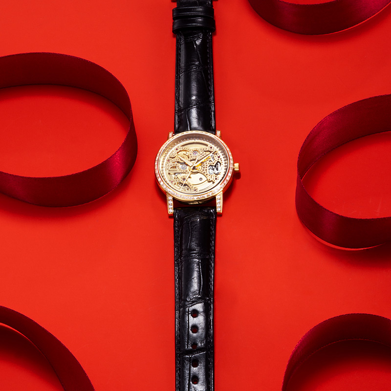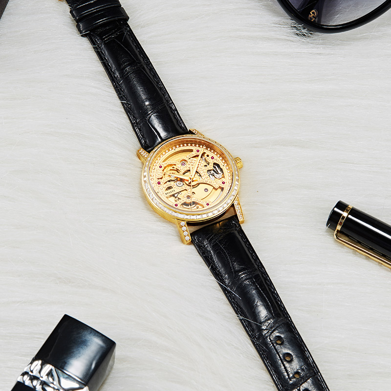 腕表吸收了古典工藝設(shè)計靈感,以完美的鏤空手工雕花全鏤空設(shè)計展現(xiàn)唯美浪漫情懷,獨特滿天星全鏤空表盤,表橋紅寶石的點綴簡直是錦上添花;與表圈上璀璨的美鉆互相輝映,精湛技藝與優(yōu)雅造型的完美結(jié)合,在陽光下折射出愛情璀璨的光芒,宣告此生情比金堅,宛如綻放的金色玫瑰,永不凋零。